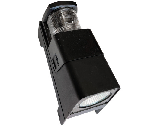- Kombination aus Topplaterne 2 sm (12 V, 10 W, SV 8,5 Soffitte) und Deckstrahler (Halogeneinsatz 12 V, 20 W, GX 5,3)