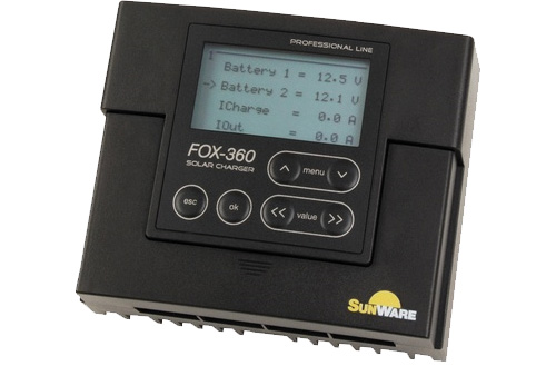 - Der FOX 360 ist ein Solarladeregler für 2 Batteriesysteme und Modulströme bis zu 20 A, geeignet für AGM-, GELund Blei-Säure-Batterien